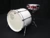 DC Custom drums, BD22,SD14 - tento set vznikl tak trochu náhodou, napsal mi jeden zákazník, jestli nemám v dílně nějaké zbytky korpusů, které by se daly použít na soupravu, na kterou chce hrát v dechovce, po pravdě toto zadání se mi hodně líbilo, protože pokud vím, žádná má souprav nebyla určena k učinkování v dechové kapele, až tato, čemuž jsem velmi rád. Ano přiznávám se, že se jedná o tzv. "lidový sběr", nebo co se doma našlo ? Vemte si to jak chcete. Basový buben byl původně ze stáje Premier, korpus je tenkostěnný, 3-vrstvý březový s bukovými prstenci, byl kompletně repasován, vybroušen, slepen, hrany atd. atd. potom bílý lak, mušle z Yamaha Recording, nohy taky Yamaha a snare, jeho korpus je zase příslušný firmě Pearl, je opět březový, ze skandinávské břízy a vznikl jako odřezek sníženého tomu, ostatní už je běžná práce, prostě se z odřezku stane snare, který má díky skvělému korpusu i předpoklady býti výborným virblem, aby to vizuálně ladilo, oblékl jsme je do pruhu fólie Red Glass, no a to je vlastně všechno