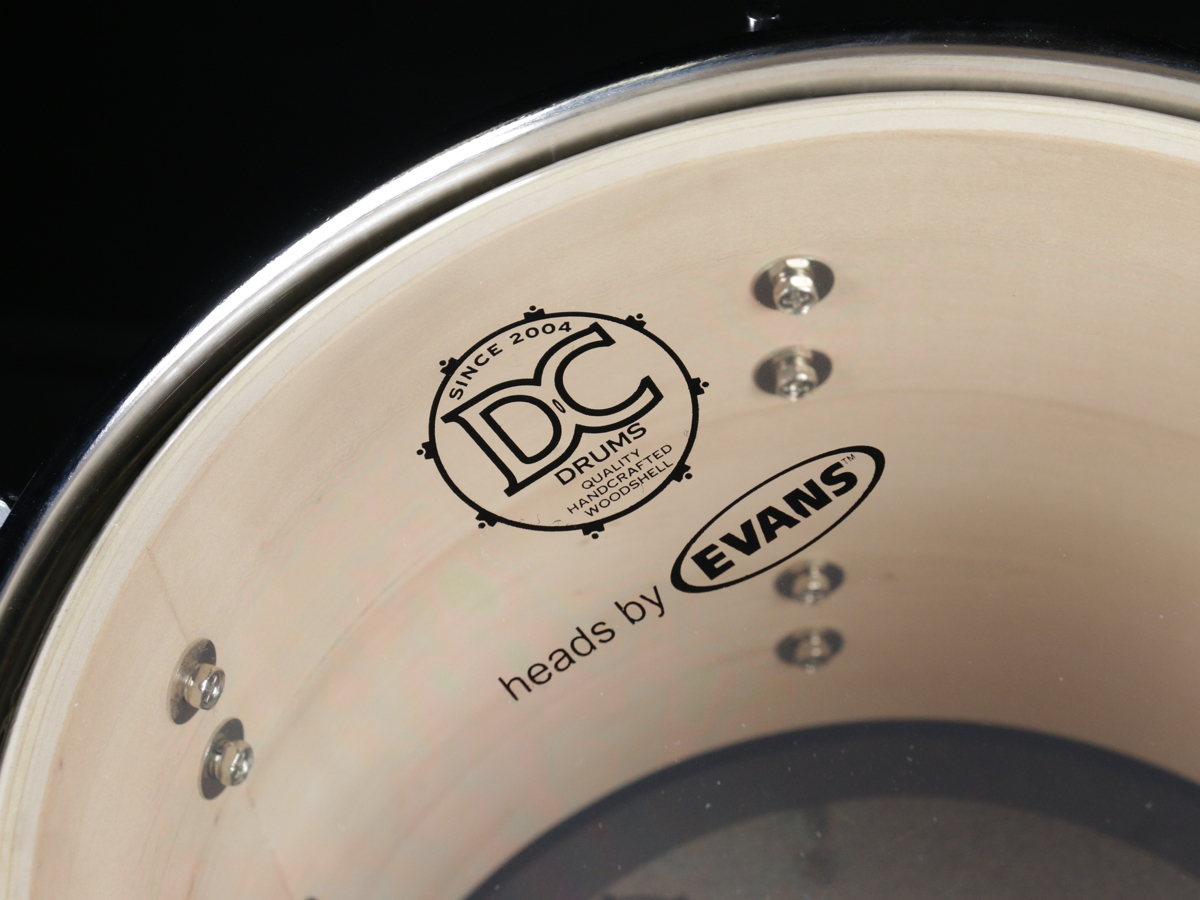 - basové bubny mají blány typu Evans EQ4 - hrací je čirá, jednovrstvá s tlumícím prstencem, rezonanční pak černá s tlumícím prstence a logem DC-drums.
