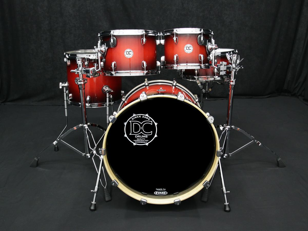 - basové bubny mají blány typu Evans EQ4 - hrací je čirá, jednovrstvá s tlumícím prstencem, rezonanční pak černá s tlumícím prstence a logem DC-drums.