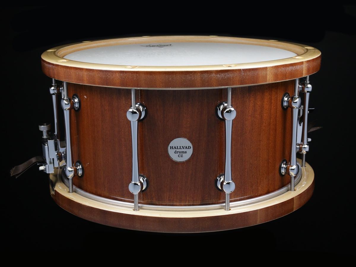 Hallvad Custom - 13 x 7 ¼“ Solid block Mahogany - snare z dílny české firmy Hallvad - korpus tohoto bubínku je přesně soustružený z vertikálních bloků masívního mahagonu. Je osazen dřevěnými javorovými obručemi opatřenými dubovou výztuží na vnitřní straně ráfku, která velice znatelně prodlužuje životnost obruče. Z venkovní strany jsou obruče nadýhovány mahagonem. 10 kusů trubkových oboustranných mušlí, velice citlivá mechanika struníku a použité mahagonové dřevo, dávají nástroji výborné zvukové vlastnosti. Hrací blána Remo Ambasador coated, rezonanční Evans, leštěný polyuretan, vnitřní strana bubínku napouštěna olejem.