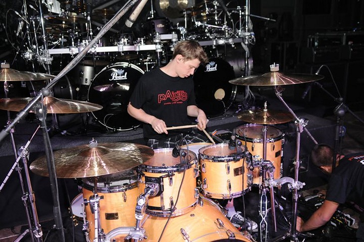 Teď už můžeme plně rozjet to naše bubenický povídání. Díky tomu, že Mike byl mým učitelem na Berklee, dovolil mi být na jeho zvukovce a zkoumat tam jeho bubny od A do Z. Hodně jsem s ním mluvil a to dokonce i jednou v průběhu koncertu, když John a Jordan měli sólo. Soupravou, kterou teď používá je Pearl Masterworks, ta se skládá z 18-ti bubnů a 18-ti činelů, všechny Zildjian. Mike mi později říkal, že soupravy má v Evropě dvě, protože by je časově nestačili přepravit a postavit - mezi koncerty DT je totiž obvykle jen jeden volný den. Tudíž zatím co on hraje na pódiu, kamión s druhou soupravou a dalším vybavením je na cestě do dalšího města, kde hrajou příští koncert. Když jsem se ho ptal, jak dlouho mu trvalo, než vymyslel rozestavění a skladbu soupravy, řekl, že na tom strávil více jak měsíc a i potom ještě stále něco měnil a doplňoval. Soupravu mu staví 2 technici a trvá jim to prý v průměru okolo hodiny. Na tomech Mike používá REMO Pinstripe a na snare REMO Emperor X,  má 4 kopáky 24x14", 2 x 22x18" a 18x16" (zleva do prava). Na dvou před sebou používá Pearl Demon Drive s plastovými beatry, na ostatní má vedenou dvojšlapku Pearl Eliminator a používá červenou vačku. Myslel jsem si, že kopáky po stranách jsou spíše na efekt, ale na 18-tku odehrál téměř celou jednu písničku a na 24-ku část přídavku. Dále používá celkem 4 Hi HATS, dvě má na kabelu a dvě zavřené. Měl bych podotknout, že Mike nemá problém hrát levou stranou těla to samé, co pravou a co víc kabelové HI HAT má dané křížem, což znamená, že když chce otevřít levou HI HAT, musí zvednout pravou nohu. To mi celkem vyrazilo dech. Stál jsem při koncertě tak 3 metry za ním a mohl tak vidět, jak automaticky střídá strany rukama a přitom nohy v opačném gardu, aniž by to člověk poznal na jeho feelu. Dost často využíval svých rychlých rukou a proto kopíroval 16-tiny v nohách jednou rukou na HI HAT a to klidně dýl, jak 4 takty (což není sakra málo!).