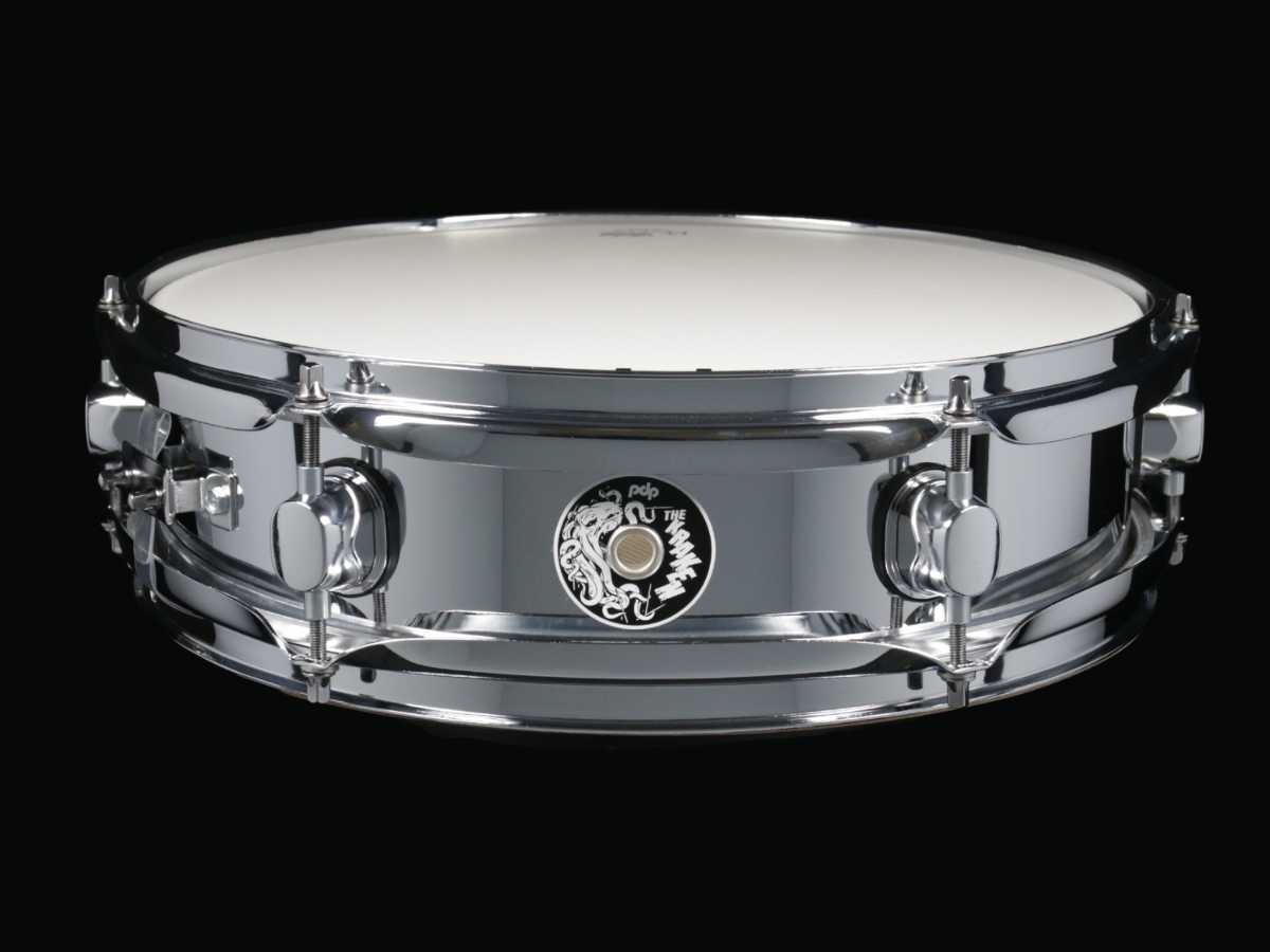 PDP KRAKEN - Piccolo snare, vyrobený z 1mm silného ocelového korpusu v chromované povrchové úpravě. Zvukově je bubínek velice výrazný, s ostrým atakem. Obruče jsou 3x ohýbané o síle 1,5mm, throw-off mechanika, DW True Pitch šrouby pro precizní ladění a blány Remo.
