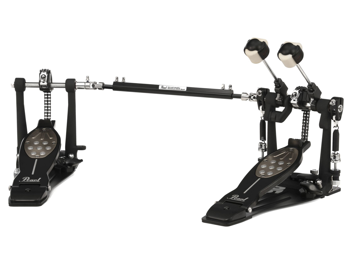 Pearl P2052C/B Eliminator Red Line Doble pedal - limitovaná edice k 25. výročí tohoto modelu, v saténově černém provedení se zlatou trakční deskou. Špičkový pedál s označním ELIMINATOR - s řetězovým převodem je pro jeho vysoce nadstandartní možnosti nastavení, spolehlivost a konstrukční dokonalost využíván obrovskou množinou světových bubeníků. Mezi jeho přednosti patří použití tzv. "Ninja bearings" - jedná se o ložiska, která byla vyvinuta ve spolupráci s výrobci skateboardů. Tyto ložiska jsou velmi rychlá, ale zároveň tichá. Další funkcí je Click-Lock Spring Adjustment, což je aretace šroubu, kterým se nastavuje pnutí pružiny a tím je zabráněno jejímu samovolnému povolování.