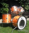 ROGERS - Londoner , 14 x 24, 9 x 13, 10 x 14, 16 x 18Překrásný asi 30 let starý set zaniklé firmy ROGERS - nepodařilo se mi zjistit zda se jedná o model XP-8, Londoner 5, neo snad Super Londoner, snad to nebude tolik na škodu, v každém případě jde o robusní soupravu vyrobenou technologií tenkostěnného bubnu se zpevňovacími prstenci, na dřevo nanesli nějaký šedivý "variopant", takže krásu vrchní dýhy si už nelze vychutnat. Téměř gigantické rozměry 14 x 24", 9 x 13", 10 x 14", 16 x 18" povrchově upraveny velmi silnou fólii pomerančové barvy, dávají soupravě noblesní vzhled.Na těchto soupravách byl snad poprvé použit patent firmy Rogers, která přišla na trh s dnes už banalitou "paměťovou objímkou", která dovolila používat na kovové konstrukce trubky, místo mnohaúhelníků. Tento patentovaný hardware dostal název "Memrilock".V současné době můžete soupravu slyšet na deskách vyškovské kapely Dark Gamballe, kde ožívá pod rukama velmi šikovného bubeníka Pavla Gottwalda.